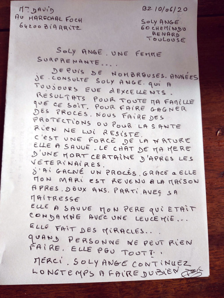 « Chère Madame Soly Ange J’ai retrouvé grâce à vous le goût de vivre, mes problèmes de santé sont résolus, après mon hospitalisation ou j’étais dans le coma avec plusieurs virus que les médecins n’arrivaient pas a surmonter, vous seule êtes arrivée à me guérir. Je suis peintre et n’arrivais plus à tenir un pinceau ni à écrire, merci merci pour tout vos soins bénéfiques, tout est rentré dans l’ordre que Dieu vous bénisse. »