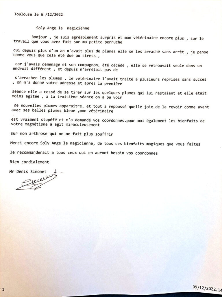 « Madame, merci d’avoir éviter l’absorption de médicaments, et d’opération, grâce à votre magnétisme et votre lotion magique. Et oui, grâce à votre pouvoir de vos mains et votre lotion, j’ai vu guérir ma chienne qui a 14 ans et qui était victime de faiblesses d’incontinence en 3 séances de magnétisme. Votre lotion est vraiment MAGIQUE ! Pour moi-même, un kist sur l’ovaire, grâce encore une foi à votre don a été guéri et j’ai évité l’opération. Tous vos travaux sont efficaces, merci Solyange ! »