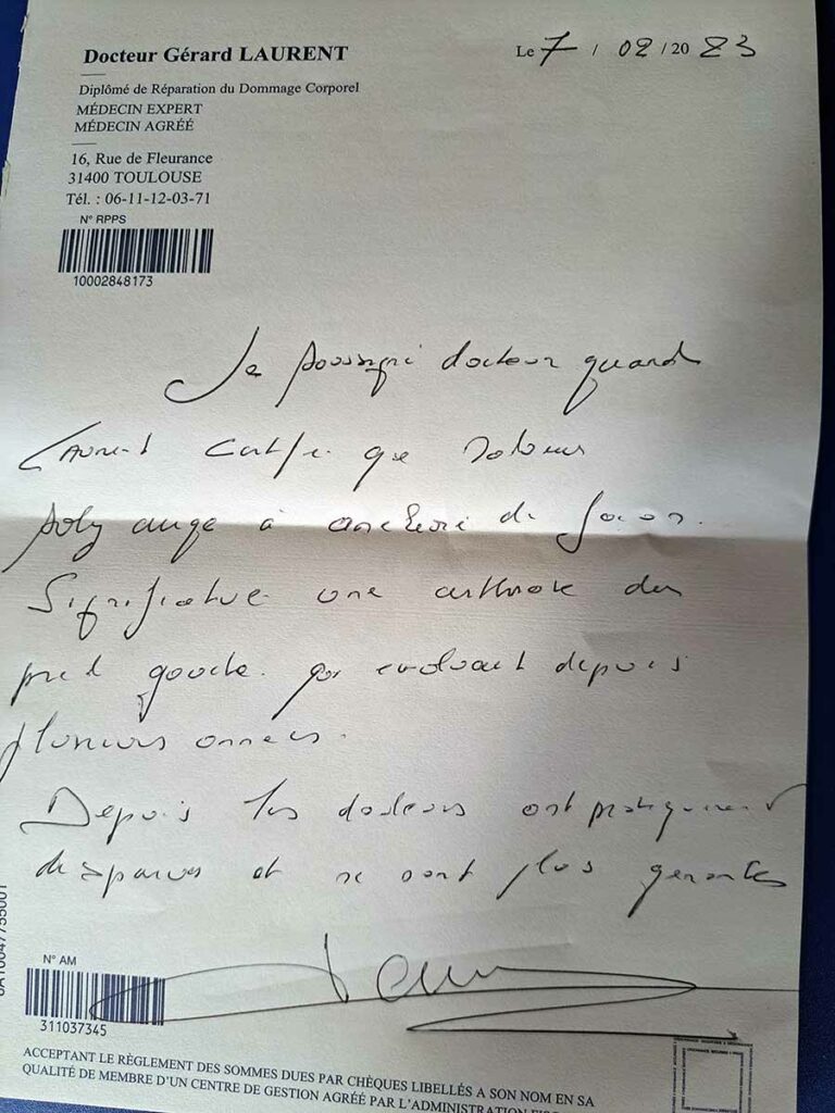 Je viens vous apprendre une bonne nouvelle, l’ophtalmo m’a dit que je n’avais plus besoin de piqûre comme il me faisait depuis plus d’un an, tous les mois, à 1500 euros la piqûre, pour la maladie de Macula. Cela est dû à vos bons soins que vous me faites depuis 3 mois, vous êtes vraiment le Docteur Miracle ! Depuis que vous avez commencé à me faire vos soins, j’y vois beaucoup mieux, alors que le médecin me disait qu’il faudrait me faire ces piqûres toute ma vie. Je vous remercie infiniment pour tout ce que vous faîtes grâce à votre magnétisme, c’est vraiment spectaculaire. Je compte encore sur vous et vous attend dans 15 jours, j’ai réservé votre avion. Merci encore Mille fois Solyange ! Je vous embrasse. Mme Augier »