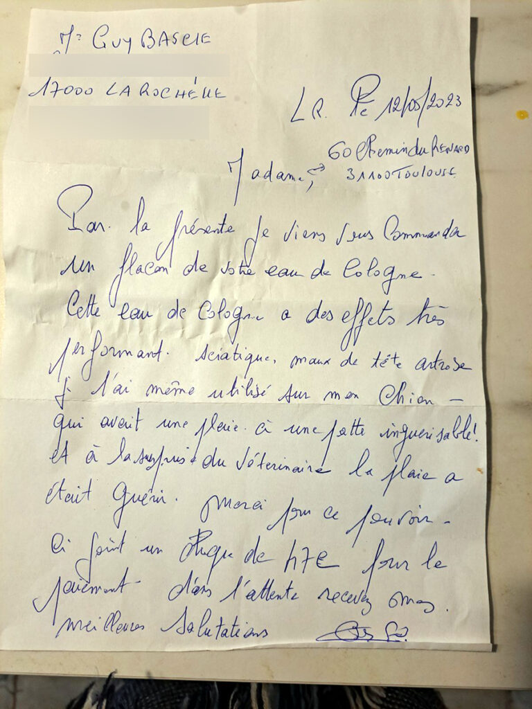 Ma mère et moi-même viennent vous remercier pour tout ce que vous avez fait pour nous. Depuis des années, Maman ne souffre plus du tout de son arthrose, alors que pendant des années elle avait du mal à marcher et se plaignait sans arrêt de fortes douleurs aux genoux, dans le dos et les cervicales. Avec votre eau de Cologne magique tout a disparu.
