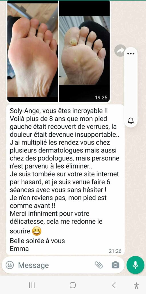« Soly-ange, grâce à votre travail, j’ai pu éviter l’intervention chirurgicale que je redoutais tant. Mon chirurgien me l’a confirmé ce jour et je tenais à vous en informer.